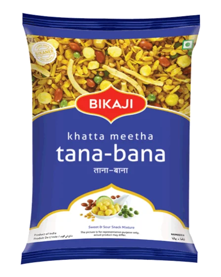 Bikaji Tana Bana is a traditional Indian khatta meetha (sweet and sour) namkeen—a crunchy snack mix made with rice flakes, lentils, peanuts, and a blend of spices. It offers a delightful mix of sweet, tangy, and spicy flavors, making it a popular choice for tea-time munching or mid-day cravings.
