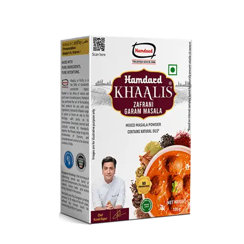 Is a blend of spices such as cumin, fennel, black pepper, cinnamon, saffron, etc. It is free from preservatives and retains natural oils. Hamdard Khaalis Zafrani Garam Masala adds aroma to your food and turns it into a culinary delight.
